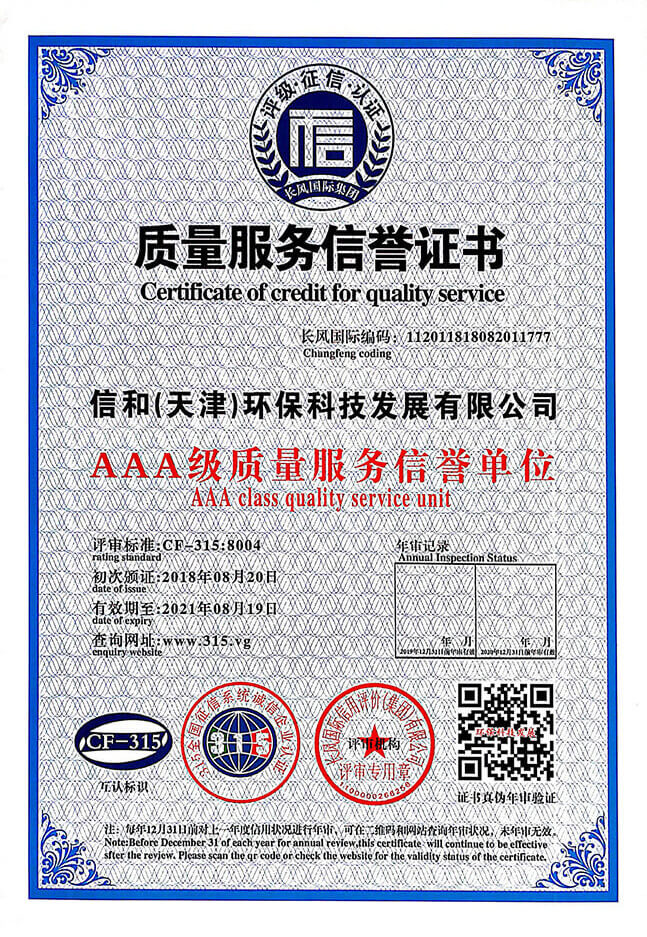 “質量就是生命”。信和重質量、守信用,被中國誠信品牌萬里行推薦“誠信示范單位”、“AAA資信等級”、“AAA級誠信經營示范單位”、“誠信經理人榮譽證書”、“誠信企業家榮譽證書”、“中國產品質量放心達標企業”、“誠信品牌聯盟會員單位”、“中國質量誠信AAA級品牌企業”、“中國百強優秀企業”、“節能環保推廣產品”、“全國科技創新企業”等榮譽稱號。